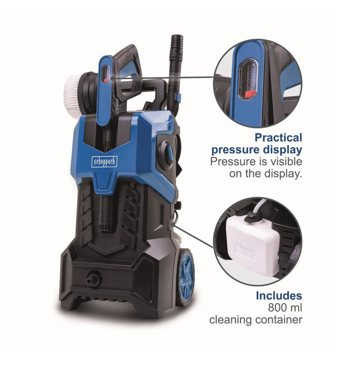 Tlaková myčka Scheppach HCE 3000 je velmi výkonná myčka s moderním ergonomickým designem a množstvím příjemných vychytávek. Mimo všech běžných úkolů s ní lehce zvládnete i většinu náročnějších úklidových prací. Díky standardně dodávanému rozšířenému příslušenství se můžete pustit do jakékoliv práce kolem domu, firmy, dílny nebo garáže. Bez problémů umyjete své auto, terénní čtyřkolku, motocykl, zahradní techniku, traktor nebo třeba loď. S turbo tryskou pak třeba vyčistíte zídku nebo spáry v zámkové dlažbě. Myčka je vybavena silným motorem o výkonu 2400 W, který umožňuje čerpadlu dosáhnout maximálního tlaku 180 barů, což je důležité pro těžké úklidové práce. Výšku tlaku můžete snadno kontrolovat na optickém ukazateli přímo na tlakové pistoli. Pro snadnou obsluhu jsou připojovací prvky a hadice vybaveny rychlospojkami. Základní příslušenství, jako tlaková pistole, kartáč nebo elektrický kabel, se dají při skladování pohodlně umístit přímo v držácích na myčce. Tlaková hadice je potom v myčce pohodlně umístěná na otočném bubnu. Velká nádržka na detergent o objemu 800 ml je integrovaná v těle stroje. Myčka je vybavena čerpadlem se samonasávací funkcí. Myčku tak lze připojit nejenom ke kohoutku s tlakovou vodou, ale myčka si může sama nasávat vodu z kbelíku, sudu nebo z jiné nádrže. Nejste tak při mytí omezeni dostupností vody z běžného vodovodního řádu. Stroj je rovněž vybaven systémem Auto stop, kdy se při uvolnění spínače na tlakové pistoli rovněž vypíná motor. Pro snadnou manipulaci a transport je myčka vybavena teleskopickým hliníkovým madlem a dvěma velkými koly.