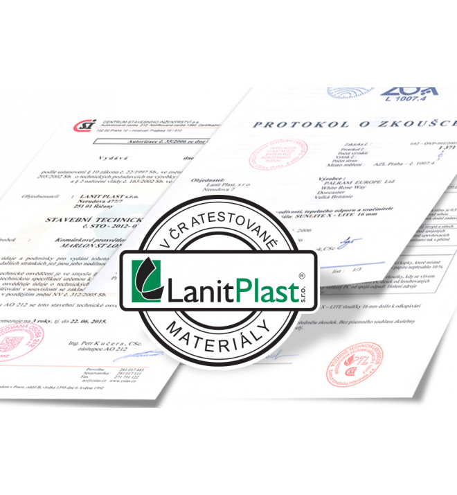 Polykarbonát - velmi kvalitní dvoustěnný polykarbonát s UV filtrem (nekřehne, nežloutne). Z důvodu zajištění maximální kvality prosklení tohoto modelu skleníku je prosklení vyrobeno firmou LANIT PLAST, s.r.o. z komůrkového polykarbonátu Marlon (výrobce Brett Martin - Velká Británie) nebo z polykarbonátu Sunlite (výrobce Palram Europe - Velká Británie/Německo). Společnost LANIT PLAST, s.r.o. je od roku 1999 jedním z největších oficiálních dovozců polykarbonátu do ČR (jako regionální partner jejich výrobců) a disponuje proto vlastními technickými zkušebními protokoly z českých státem akreditovaných zkušeben. Jedná se tak o jedny z mála skleníků na českém trhu, které jsou osazené kvalitním polykarbonátem s doložitelnou českou certifikací.