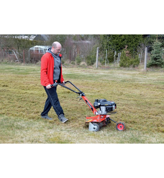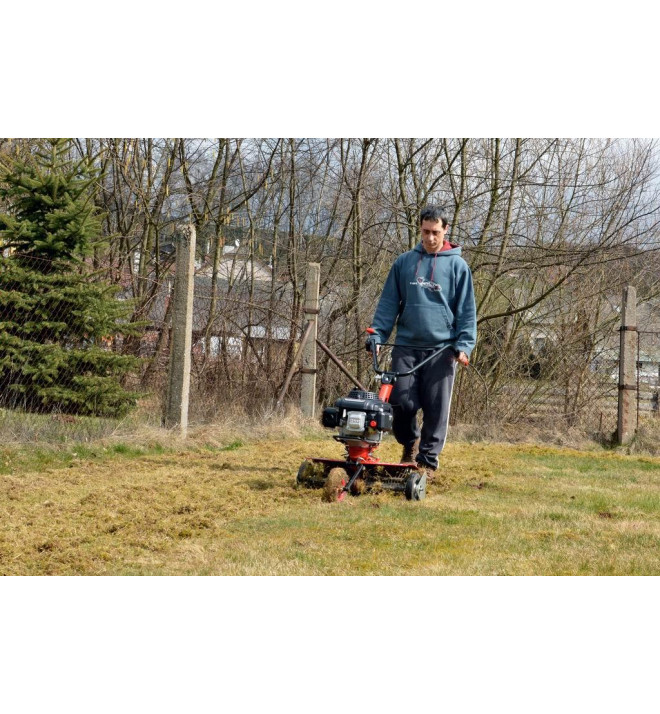 Pokud již vlastníte rotační plečku, pomocí tohoto přestavbového setu, který obsahuje dvě unášecí klece s osovým čepem, sadu vyčesávacích pružin, sadu vertikutačních nožů, boční vodicí kola, sklopné startovací opěry, bezpečnostní kryt a zadní brzdicí ostruhu, snadno přestavíte na provzdušňovač/prořezávač trávníků. Ostatní potřebné díly, tedy převodovku, přední vodicí kolo, držák radličky a zajišťovací kolíky, použijete ze své rotační plečky.