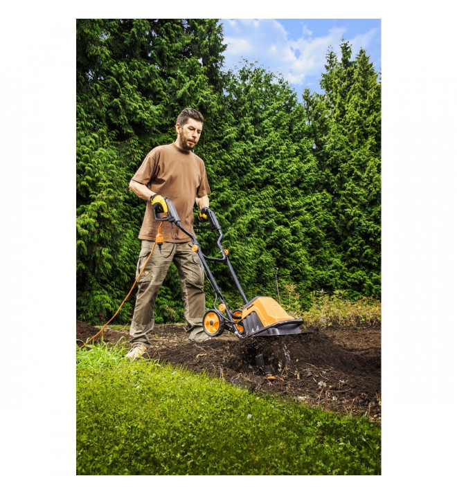RET 4014 - kultivátor s elektrickým motorem 1400 W • ideální pomocník pro menší až střední zahrady, zeleninové záhonky, skleníky, květinové záhony v předzahrádkách ap. • kompaktní a díky transportním kolečkům a přednímu madlu i snadno ovladatelný a přenosný • práci s ním hravě zvládnou i ženy • ušetří spoustu času a tvrdé práce při přípravě záhonu, velmi snadná obsluha Motor • tichý chod motoru neruší hlukem ani v hustě zastavěných prostorech • speciální tvar nožů pro důkladné rozmělnění zeminy • kovová převodovka pro dlouhou životnost stroje Další vlastnosti: • bezpečnostní vypínač s lehkým chodem • úchyt kabelu zamezující jeho poškození • tepelná pojistka chránící motor proti poškození přehřátím • dvojitá izolace kovových částí pro vaši maximální bezpečnost • skládací rukojeť pro snadný transport i skladování • výborný pomocník při kypření půdy, při úpravě půdy před setbou a zapravování drtě, hnojiva, kompostu nebo rašeliny do půdy Vyšší výkon a s větší šířku zíběru nabídnou benzínové kultivátory Riwall RPT 4040, RPT 6060 nebo RPT 8070 R.