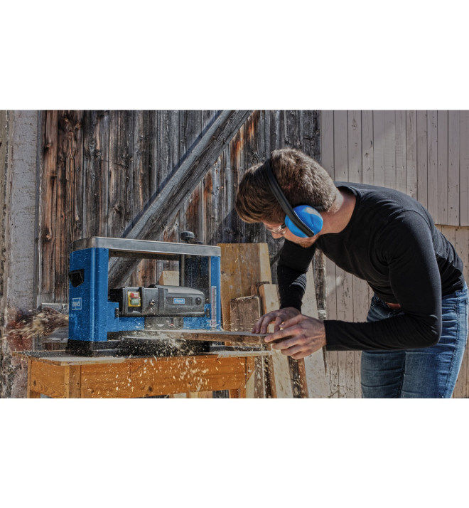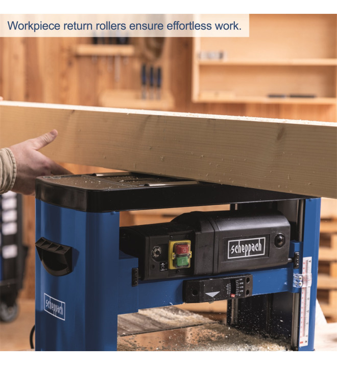 Scheppach PLM 1800 je moderní výkonná protahovačka na dřevo. Chytrý kompaktní design minimalizuje prostorové nároky v dílně a usnadňuje transport stroje. Robustní konstrukce zvládá bez problémů práci s hranoly o šířce až 330 mm a výšce 152 mm. Silný motor 1500 W spolu se dvěma ocelovými noži rotujícími rychlostí 8500 ot./min. se starají o velmi čistý a přesný řez, což v praxi znamená ještě jemnější opracování plochy. O posun dřeva se stará robustní mechanismus s rychlostí pojezdu 7,4 m/min. Nože jdou velice snadno vyměnit a celé ovládání stroje je velmi jednoduché a komfortní. Výšku nastavíte jednoduše pomocí optické stupnice a otočného ovladače na horní straně protahovačky. Na přesnosti opracování se podílí i velmi kvalitní ocelový hoblovací stůl s možností prodloužení. Samozřejmostí jsou i transportní madla a prachuodolný bezpečnostní spínač. Stroj získal mnoho prestižních ocenění, jako například vítěz kategorie nejlepší nákup ve World Tools Awards.