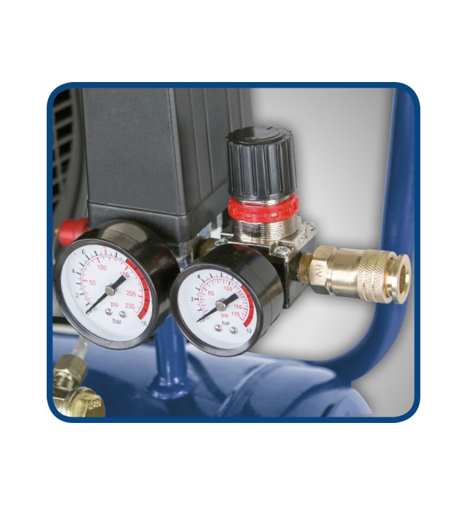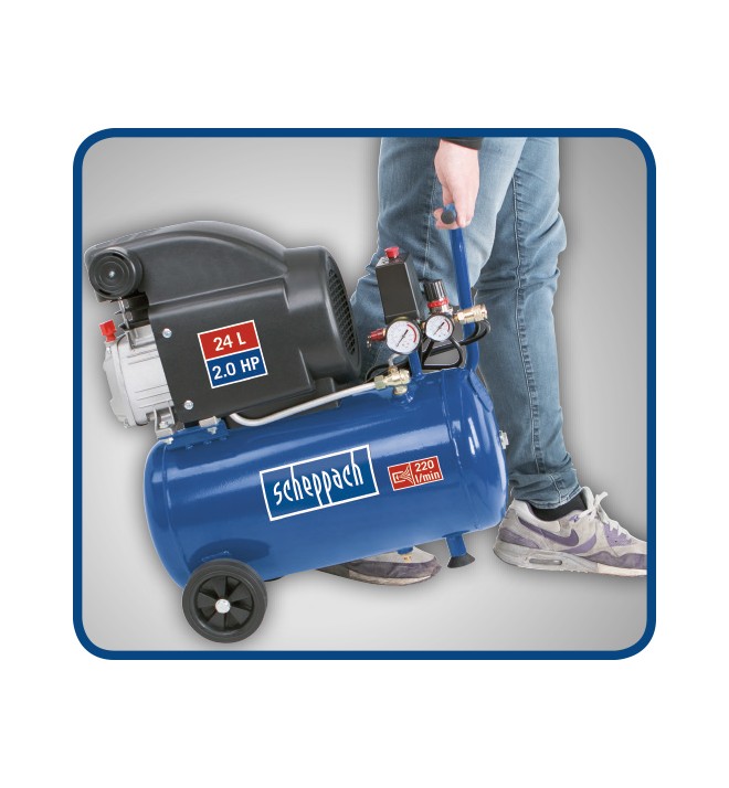 HC 25 - olejový kompresor Kompresor Scheppach HC 25 je nezbytným pomocníkem, který by neměl chybět v žádné domácí dílně. Pumpa stroje je u tohoto kompresoru mazána olejem, což prodlužuje životnost celého stroje i při častém používání. Kontrola oleje je velmi jednoduchá a provádí se zběžným pohledem pomocí optického ukazatele umístěném na stroji. Vzdušník slouží jako zásobárna stlačeného vzduchu a motor se tak zapíná jen v případě, že tlak vzduchu klesne pod požadovanou úroveň. Díky vzdušníku můžete s kompresorem provádět i náročnější operace, než je běžné huštění či ofukování. Můžete k němu připojit třeba sponkovačku nebo zvládne i méně náročné práce se stříkací pistolí a dalšími pneumatickými nástroji. Při dofukování pneumatik zase oceníte jednoduché nastavení výše tlaku, který můžete snadno kontrolovat pomocí vestavěného manometru. Přídavná rukojeť a kolečka umožní snadnou manipulaci se strojem. Stroj je díky svým kompaktním rozměrům velmi skladný a dá se snadno převážet. Další výbava manometr vzdušníku, manometr pro kontrolu nastaveného pracovního tlaku, redukční ventil tlakový spínač odkalovací ventil zpětný ventil, pojistný ventil vzduchový filtr pojezdová kola rukojeť Jiné kompresory Scheppach • bezolejové - HC 16 W • olejové - HC 24, HC 54, HC 50, HC 51, HC 16 • olejové dvouválcové - HC 52 dc, HC 53 dc