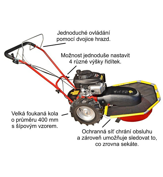 Stavebnicová bubnová sekačka s pojezdem; záběr sečení 60 cm; max. výkon motoru Honda 5,5 HP; dvě rychlosti vpřed