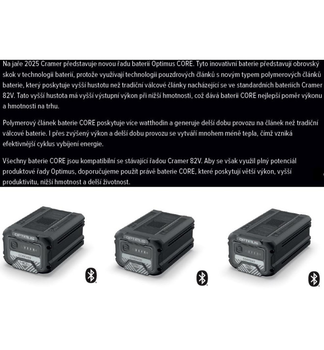 Cramer výrobky z řady 82V poskytují větší výkon s menším proudem než komerčně dostupné systémy s nižším napětím. Nižší proud znamená, že bateriové články nemusí pracovat na maximální úrovni. To generuje méně tepla, zvyšuje účinnost a životnost baterie. A snížení rizika náhlých přerušení v důsledku přehřátí článků a motorů. Bateriový systém Cramer 82V dodává potřebný výkon a je připraven na budoucnost pro ještě vyšší výkon. S výrobky Cramer 82V můžete vždy získat vysoký výkon na rozdíl od nízkonapěťových systémů.
