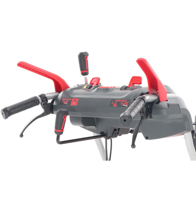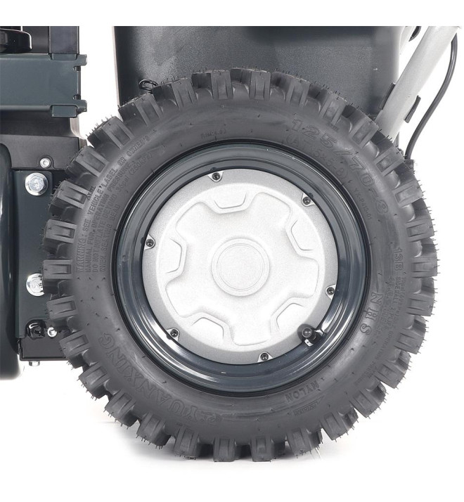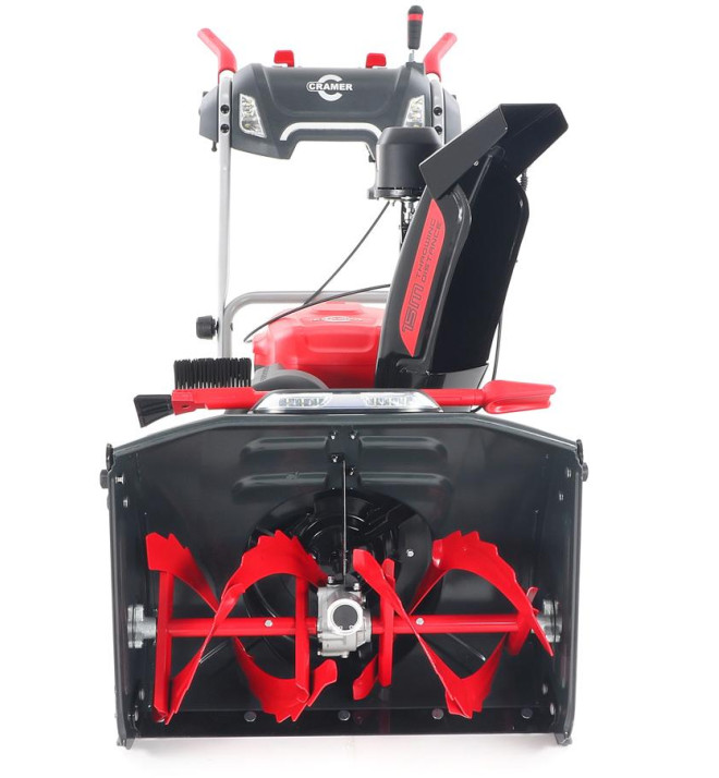- Dvoustupňový odhazovací systém se šnekem z kalené oceli pro nabírání sněhu do přední části stroje a vysoce účinná turbína odhazuje nasbíraný sníh vyhazovacím komínkem